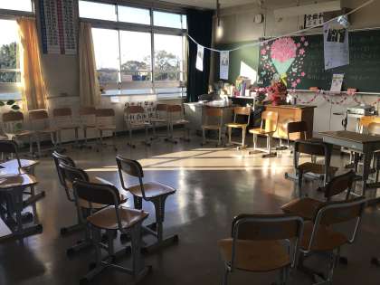 朝の校舎を回ってきました。いつもこの時間には必ず3年生教室の窓が開いていましたが、今日は閉まっていました。がらんとした3年生教室。