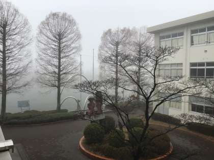 今朝は珍しく霧が立ち込めています。生徒の皆さん、安全に登校してくださいね。