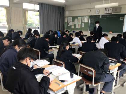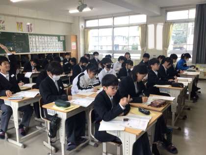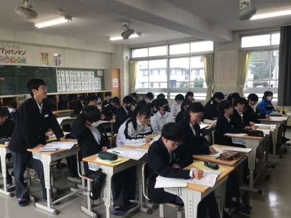 写真は1年4組の数学です。確率の勉強をしていました。難しそうな内容です。数学、というからには、本当の意味で数学は「数の学問」なのだと思います。解けることは大事でしょうけれど、解き方、考え方が大事なのだと思います。生徒たちはいろいろな解き方をしてそれを発表しあっていました。こんな解き方もあるのだということを友達の意見から気付くことができるといいですね。