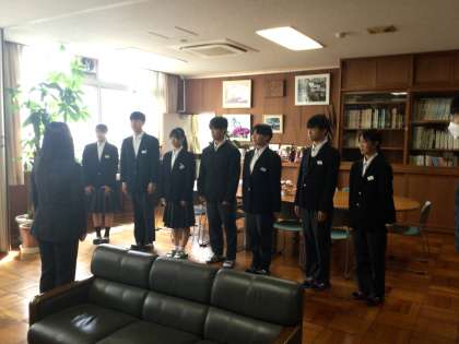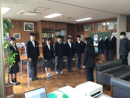 3月19日の様子です。先週、次年度に向けた生徒会役員選挙が行われ、4月から前期生徒会役員として頑張ってくれる皆さんが校長室に挨拶に来てくれました。役員として頑張りたいことを一人一人がしっかりと話してくれて、大変頼もしく感じました。役員全員で力を合わせて全校をリードし、様々な取組を行ってくれることを期待しています。半年間、よろしくお願いします!