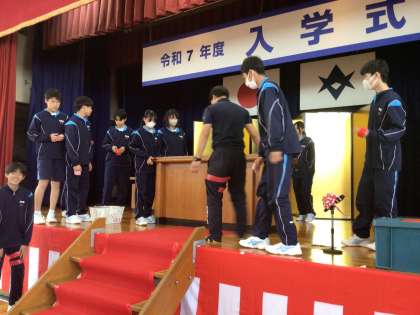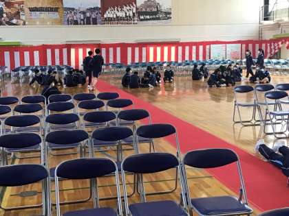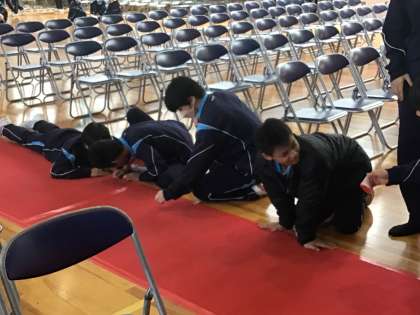 3年生が入学式の会場準備をしてくれています。赤絨毯は新入生が歩く大切な場所です。まっすぐに絨毯を敷いたら、小さいほこりまで丁寧に取っていました。1年生の皆さん、先輩が準備してくれた赤絨毯の道を胸を張って歩いてくださいね。良い入学式にしましょう。
