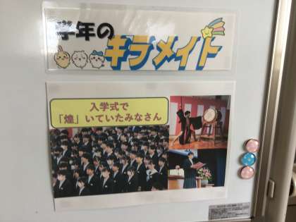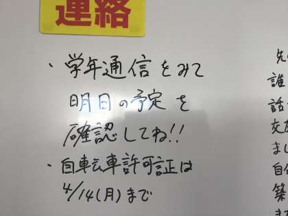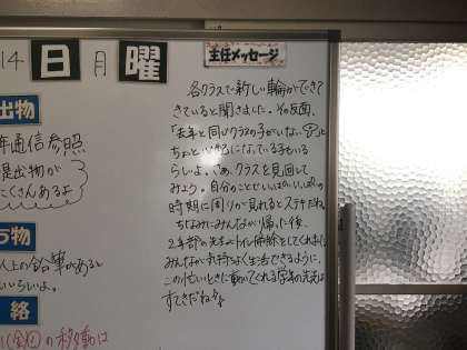 各学年のフロアには連絡用のホワイトボードがあり、翌日の連絡や持ち物、提出物などの連絡のほか、学年主任からのメッセージなどが書かれています。月曜日はクレペリン、学級活動、避難訓練などがあります。学年主任がそれぞれ学年の生徒たちへの思いをつづっています。私も足を止めていつもメッセージを読みます。