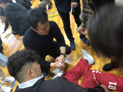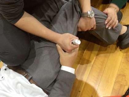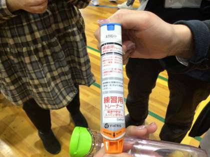 緊急時には教員がエピペンを打たなければいけないケースもあります。学校にはエピペンを打つ練習をするためのトレーナーがあります。実際にその器具を使って練習をしました。
