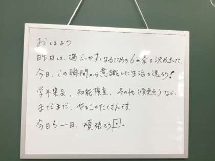 生徒登校前の静かで賑やかな学校。窓を開ける音、電気のついた教室、連絡の書かれた黒板、チョークの音、先生たちが打ち合わせをする声、廊下を歩く音。もうすぐ生徒が登校してきます。