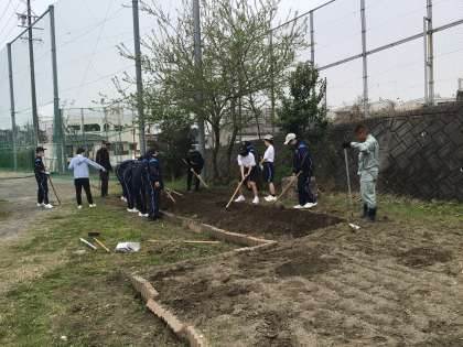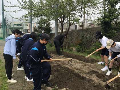 1時間目、1、2、3学級の生徒たちが畑づくり(畝作り)を行っていました。運動場の隅にある学校園で野菜を育てます。今日は土を耕してフカフカにして畝を作る作業です。土が良ければきっと野菜もよく育ちます。野菜づくりが得意な校内整備員の鈴木さんに畝作りを教えてもらいました。