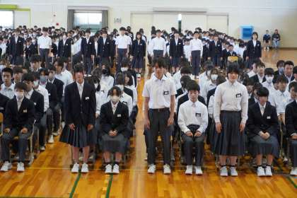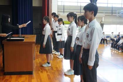 昨日行った認証式の様子です。前期生徒会役員の認証式は3月の生徒会選挙後に行いましたので、今回は各委員会の委員長と各学級の級長の認証を行いました。どの生徒も大変立派な返事、態度で、さすがにリーダーとして選ばれただけがあると頼もしく感じました。