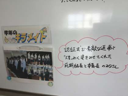 各学年のフロアには気持ちが、ほっこりする掲示物があったり、メッセージが書かれていたりします。写真は3年生に向けた掲示物です。上から、級訓紹介、ハッピーバースデーの小さな黒板(※生徒の名前は伏せてHPにアップしています)、先日の認証式の立派な姿を褒める学年主任からのメッセージです。生徒の皆さんは足を止めてぜひ見てくださいね。