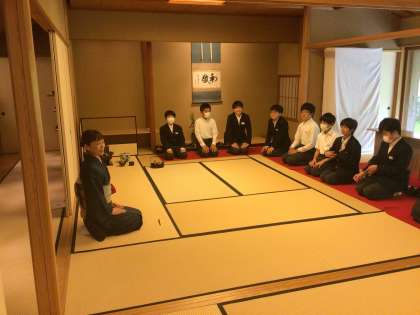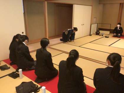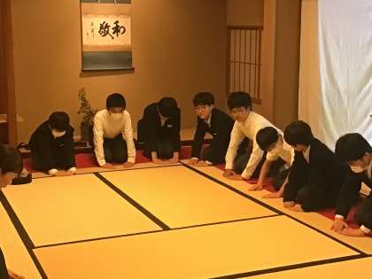 お茶室体験の様子です。今日は裏千家のお茶の作法を教えていただきました。まずは礼の作法。真の礼、行の礼を教えていただきました。