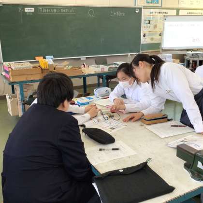 写真は2年1組です。技術の授業を受けていました。内容は電気に関することです。技術科では電気、栽培、情報、木材加工、金属加工など様々な内容を学習します。
