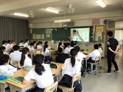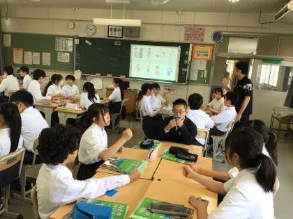午後の授業の様子です。写真は1年5組です。ALT(Assistant Language Teacher※外国語指導助手)と教科担任とのTT(チームティーチング)の授業です。カードを引いて班で英会話をする活動をしていました。