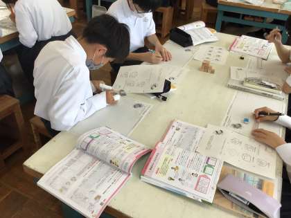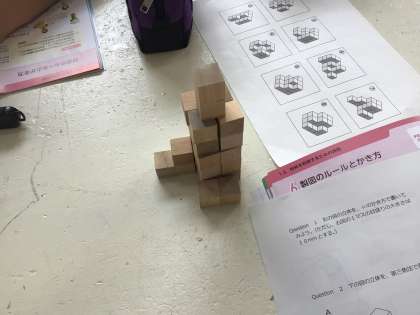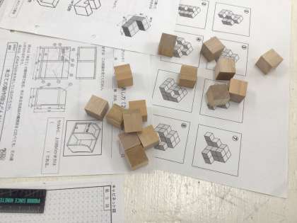 1年7組の技術の授業です。製図について学習していました。小さなサイコロ状のものを組み立て、それを図にかきます。生徒たちは一生懸命に取り組んでいました。