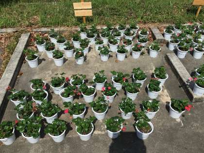 技術科で3年生が植えたイチゴの鉢が並んでいます。花が終わって実が育ち始めている鉢もありました。
