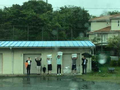 先生たち、ありがとう!朝から41回生の修学旅行のために雨の中傘をさして運動場の誘導などたくさん支えてくれました。嬉しいメッセージでお見送りをしてくれました。バスの中からみんなで手を振りました。良い修学旅行にしてきます。行ってきます!