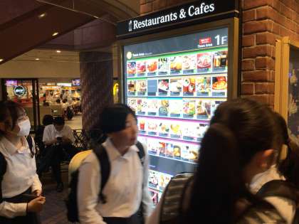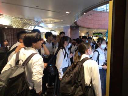 舞浜駅に隣接した商業施設イクスピアリにきました。約1時間半、各班で夕飯を食べ、買い物もできます。ただ、お小遣いはディスニーなどのために残す額は残しておきましょうね。「何を食べようか」真剣に飲食店の表示を見る生徒たちです。たくさん食べる場所があって迷いますね。