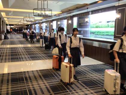 おはようございます。青空が窓の外に広がり、カーテンを開けた生徒たちが嬉しそうにしていました。今日は朝食後すぐにバスに乗り込み、学級活動に出掛けます。生徒たちは6時20分に起床、大きなカバンを持って朝食場所に集まってきました。今日も良い1日にしたいです。