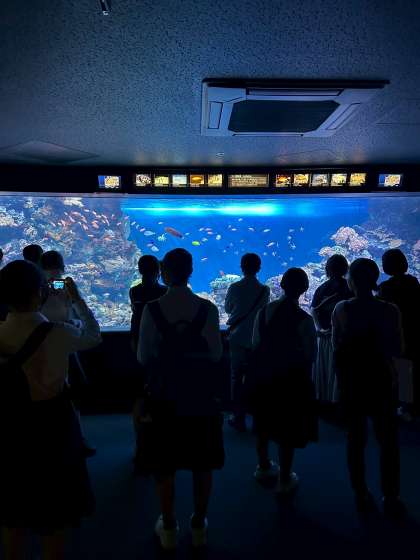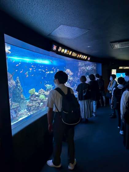 7組はサンシャイン水族館。涼しくて快適。生徒たちは熱心に水槽を覗き込んでいます。