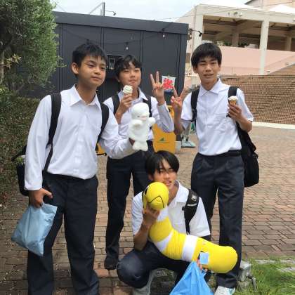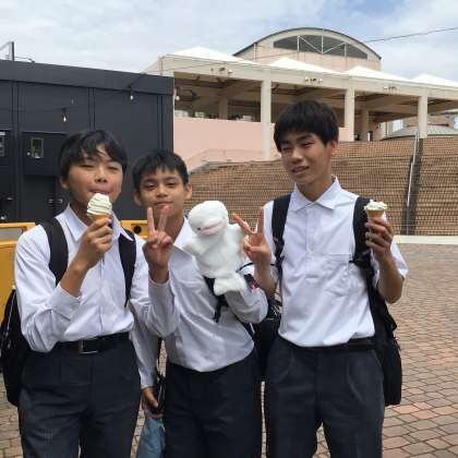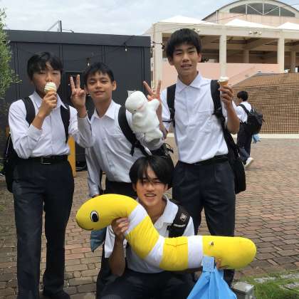 チンアナゴやイルカのぬいぐるみ(パペットと抱き枕)をゲットして嬉しそうな少年。