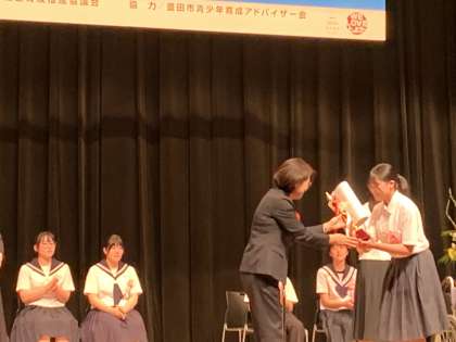 3年生の松井さんの発表が優秀賞に選ばれました(今日発表した10名のうちの5名)!優秀賞の生徒5名はこのあと行われる上位大会に豊田市の代表として出場します。おめでとう!次も頑張ってね!大変立派でした。