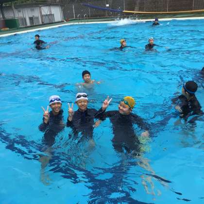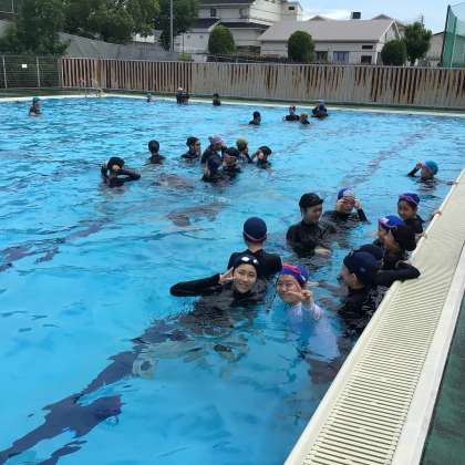 今日から体育の授業で水泳が始まりました。生徒たちは歓声をあげながら楽しそうに活動しています。先週は雨が多く、水が温まるような日がなく水温は低めですが、みんな笑顔で活動を楽しんでいました。