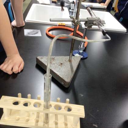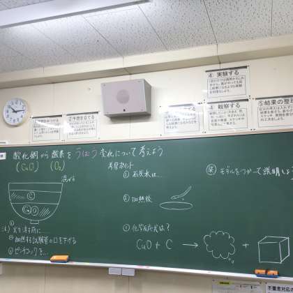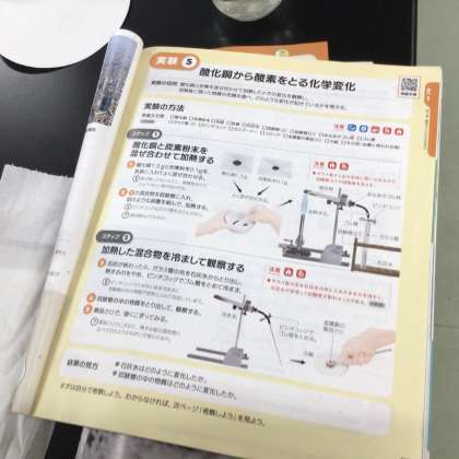 一方の試験管には石灰水が、もう一方の試験管には酸化銅が入っています。色や状態の変化を観察し、考察します。