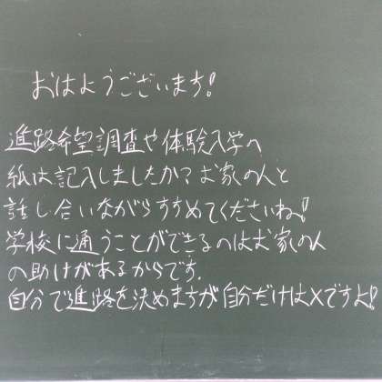 3年生にとっては進路を決めていく意味でも大切な夏です。続々と体験入学の案内が中学校に届いています。きずなネットでも配信しているとおり、情報に気をつけて積極的に体験入学に参加してください。