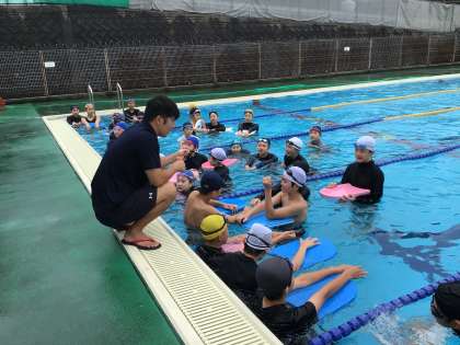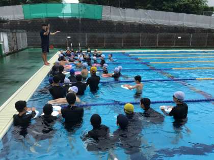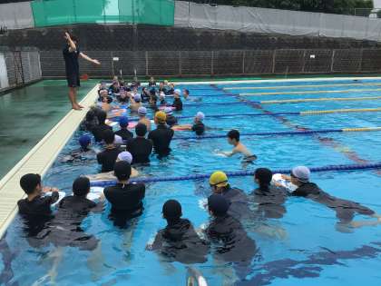 1年6、7組の体育の様子です。生徒たちの手にはビート板。今からバタ足で50メートル泳ぐそうです。