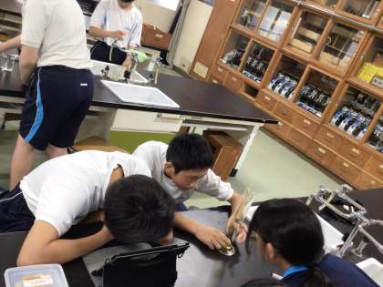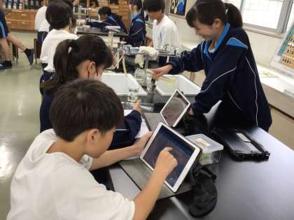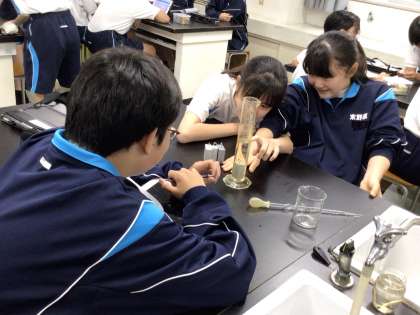 1年2組の理科の様子です。班で熱心に実験中。