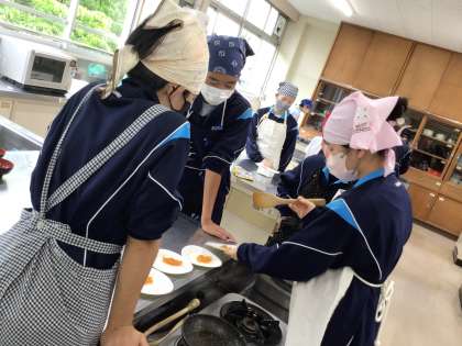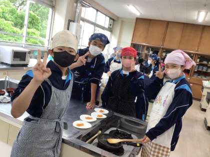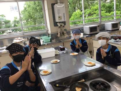 取材に行った時、生徒たちはちょうど盛り付けをして食べるところでした。「どこが難しかった?」と聞くと「皮むきです」「洗い物です」という答えが返ってきました。「洗い物?」と聞くと「はい、僕は洗い物が苦手なので」という言葉が返ってきました。ちょっとおもしろかったです。家でぜひ自分のお皿を洗うようにしましょうね(もちろん、はしセットもね。)