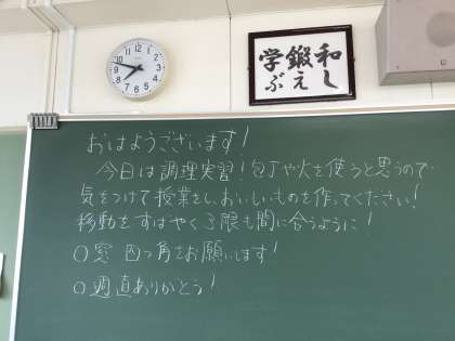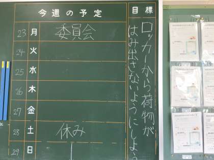 2年生の教室です。生徒登校前の静かな教室。エアコンの風が扇風機で送られてきます。生徒が登校した時に快適です。今週の目標がうしろの黒板に書かれています。「ロッカーから荷物がはみ出さないようにしよう」。そして、このクラスのロッカーはきれいです。