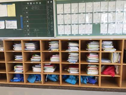 荷物が多いので大変ですが、みんなで使っているロッカーです。ロッカーは4段になっていて、一番下のロッカーは3人で共有するロッカーです。このクラスでは体育館シューズが3人分入っているようですね。