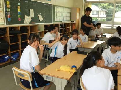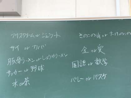 毎回、決められたお題について仲間と対話します。「きのこの山とたけのこの里、どっちが好きか」「アイスクリームとジェラートどっちが好きか」その理由も添えて話します。聞く側は頷きながら、互いに目を見て話をします。写真は1年生です。堅苦しくなく笑顔で話をする生徒たちの様子です。