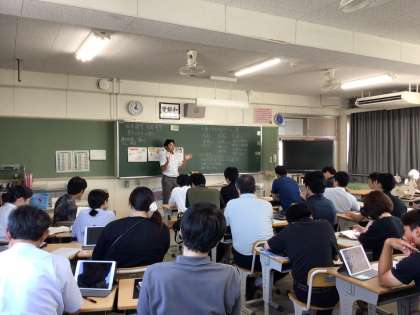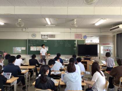 生徒が下校したあと、2年生の教室で社会科の模擬授業を行いました。授業者の先生が実際の流れで授業を行い、他の先生たちは生徒役になって授業を受けました。生徒目線で授業を受けることで見えてきたことについて、生徒役の先生たちから様々な意見が出されました。模擬授業は指導力を高め、授業を練り上げる有効な手立てです。