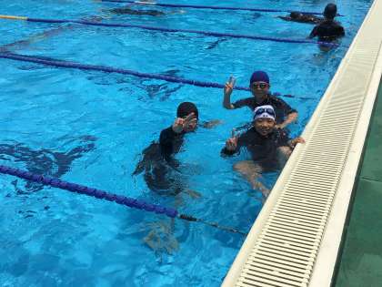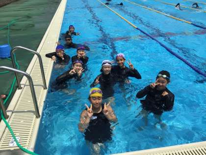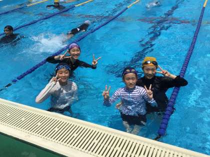 水がキラキラ。気持ちいいですね。写真は1年6、7組です。クロール練習中。