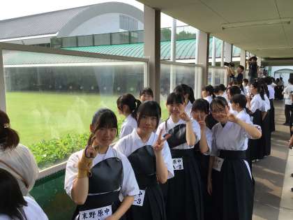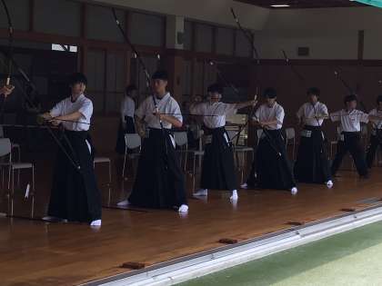 写真は弓道の様子です。朝から男女各チームの団体戦が行われています。3人でひとつのチームを組んで的に当たった合計回数を競います。