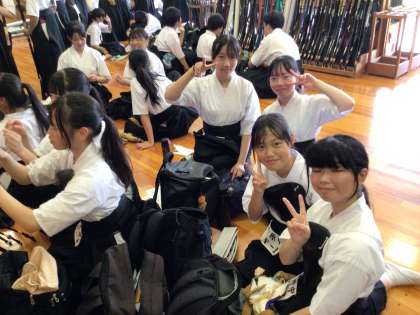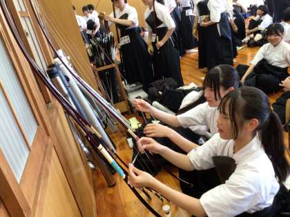 弓道の大会の様子です。写真は出番を待つ生徒たちの様子です。丁寧に道具の準備をしてる部員たち。頑張ってください!
