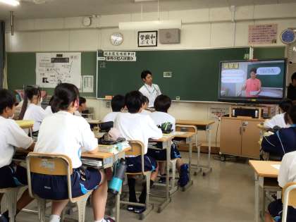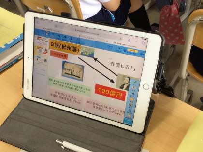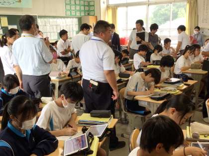 5時間目の2年6組の社会科の授業です。今日は美里中学校から社会科の教科指導員の先生をお迎えして、授業研究を行いました。学習内容は「開国と近代日本の歩み 江戸幕府の滅亡」です。