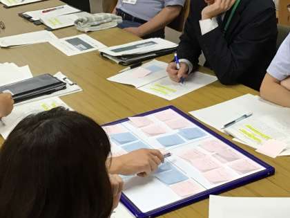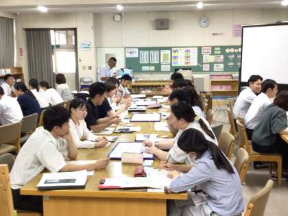 授業後の研究協議会の様子です。生徒たちが関わり合い、意見を深め合うことで学びを深め、新たな気づきを得るために、教師はどのような支援をするのが有効であるかを話し合いました。