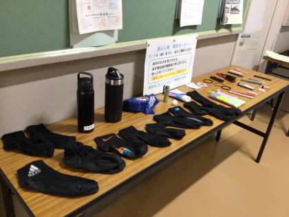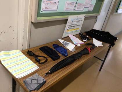 写真は職員室前の落とし物コーナーの様子です。きずなネットでもお知らせしましたが、心当たりのある方は、ぜひ見に来ていただければと思います。靴下やクシなど、似たようなデザインのものも多く、なかなか引取り手がないかと思いますが、鍵などもありますので、ぜひチェックしてください。探しものが見つかった場合は、どの職員でも結構ですのでお声かけをお願いします。
