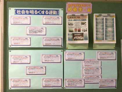 落とし物コーナーの近くの掲示板には、地域学校共働本部の掲示板があり、地域コーディネーターの方がこまめに掲示物を作成してくださっています。今は、お便りや、ボランティアに参加した生徒たちの感想などが掲示してあります。こちらもぜひご覧ください。