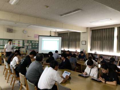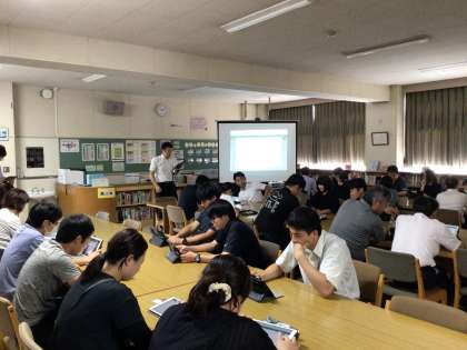 8月下旬の校内研修の様子です。この日は、本校の先生が外で受けてきた内容を校内で伝達する研修でした。内容はICT活用上級編です。9月からの授業に役立つ内容でした。