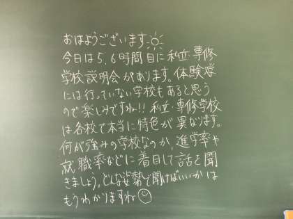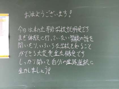 今日の5、6時間めは3年生を対象とした私立専修学校説明会です。ご参加いただける保護者の皆様、よろしくお願いします。説明会に合わせてたくさんの先生方が高校や専門学校からお越しくださいます。