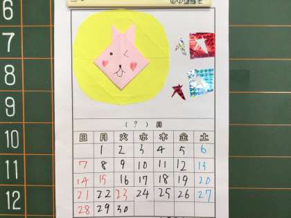 写真は毎月1、2、3学級の子たちが作ってくれるカレンダーです。満月の中にうさぎ、星もキラキラ光っています。一生懸命に作ってくれました。ありがとう。今日は皆既月食が見られるそうですよ。(←今日の明け方に終わってしまったそうです。残念)
