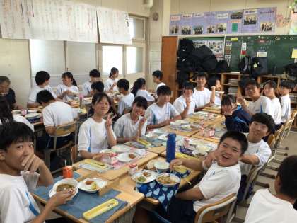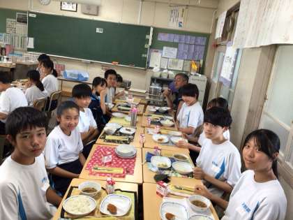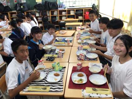開放感MAXの気分でいただく給食のお味はいかがですか?今日は中華飯と鶏肉のフライが出ました。いつもに増して美味しいですね!写真は2年生です。