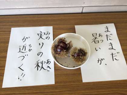 暑いですが、季節は確実に秋に向かっています。秋は美味しいものがたくさんありますよね。自宅の畑で採れた栗を国際教室前の廊下に先生が飾ってくれました。外国籍の生徒にも読めるようにルビが振ってあります。イガに入った艶やかな栗。季節を感じます🌰