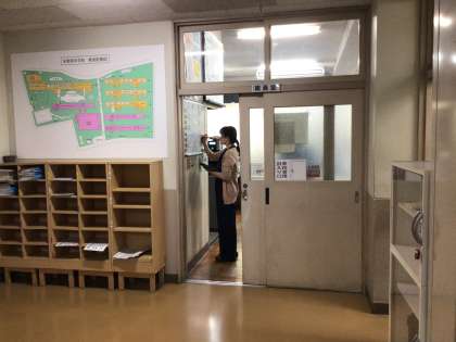 玄関で生徒を迎える先生、各フロアの階段や廊下で生徒を迎える先生、職員室で連絡を受けたり、タブレットで入ってくる欠席遅刻等の連絡を確認する先生もいます。朝の8時、学校は一斉に動き始めます。