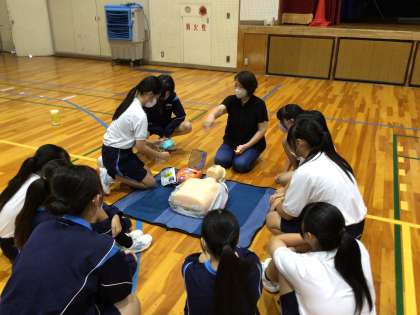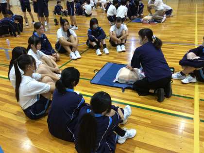 今日は2年生6クラスの全ての生徒が2時間目から4時間目にかけて講習を受けます。写真は2時間目の様子です。胸骨圧迫とAEDの操作等について勉強しました。