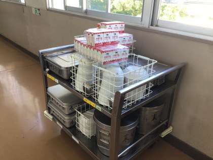 全校で23クラス分の給食を、4人の職員で各フロアまで運んで毎日準備をしています。数の調整などさまざまな作業を経て生徒たちのもとに給食が届きます。今日の給食はおひたし、大根のそぼろ煮、ご飯、牛乳、フライでした。ごちそうさまでした。