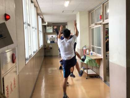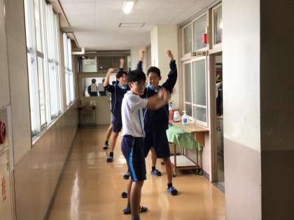 昼休みの様子です。3年6組の教室前廊下で踊る数名の男子生徒に遭遇!教室では生徒たちが末中ソーランの練習中。机がある中で立ったりしゃがんだり、移動したり。教室では十分に踊れないので廊下に数人が出てきて踊っているのだとわかりました。
