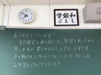 おはようございます。体育祭まで残り2日となりました。体育祭終了までがクールビズ期間です。例年であればまだ暑さ指数に注意を払って活動をしているところですが、今年はむしろ急に冷えてきて体調を崩さないか心配だと感じるくらいの涼しさです。元気に体育祭本番を迎えてほしいです。