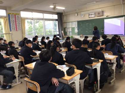 1年生の英語です。Do,Does,Didなどの変化、単数形と複数形などを組み合わせた表現の変化について学んでいました。難しくなってきましたね。授業をしっかり聞いて早めに復習に取り組みましょう。